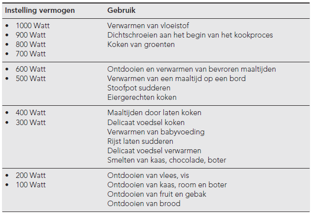zie onderstaande tabel voor welk vermogen er gebruikt wordt, bij welke te verwarmen product.