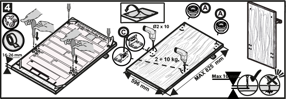 - Controleer of het deurpaneel van de vaatwasser voldoet aan de maten die op de installatie instructie zijn aangegeven.