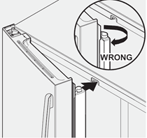 Pas de verticale deurstijl aan voor een goede verbinding met de kastgeleider door ervoor te zorgen dat de deurstijl is ingeklapt en loodrecht op de koelkastdeur staat. Als de deurstijlgeleider niet in de juiste positie staat, kan dit voorkomen dat de deur volledig sluit.