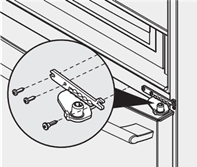- Om toegang te krijgen tot het onderste scharnier, moet de lade worden uitgeschoven. Draai de drie onderste scharnierschroeven los en schuif het scharnier naar binnen. Til de deur op en verwijder deze van het onderste scharnier.