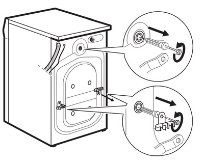 - De transportvergrendeling bestaat uit drie lange schroeven, die zich in de achterwand van de wasmachine bevinden.